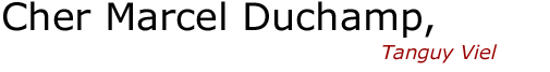 Je sais bien, cher Marcel, qu'il y a le Nu descendant l'escalier, je sais bien qu'il y a la Mariée, le Grand Verre et les Etants donnés, mais quand je pense à vous, ce n'est pas à ça que je pense. C'est au vide, en fait, au silence bien sûr mais surtout au vide, à l'oisiveté, peut-être à l'empêchement, à la vanité, puisque vous-même l'avez formulé un jour de fatigue parmi d'autres, vous avez dit : « faire ça ou autre chose