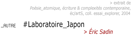 Le territoire japonais peut être tenu comme un laboratoire privilégié d'observation des transformations de nos rapports aux signes, marquées par le phénomène majeur de la prolifération. Il expose un champ d'étude et d'analyse de comportements qui n'opposent pas de résistance a priori, qui au contraire savent superposer protocoles et gestes distincts, qui profitent avec fluidité des possibilités juxtaposées offertes par les effets de foisonnement, qui caractérisent cependant notre contemporanéité partagée.