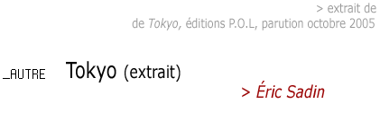 « Tokyo_Reengeneering> » n'est qu'une facette d'un plus vaste projet qui s'intitule « Tokyo ». Texte à paraître aux éditions P.O.L, en octobre 2005.