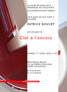 À l'issue des séances, ils ont finalement choisi d'inviter Patrick Bouvet, auteur particulièrement inclassable, et qui refuse, même, cette appellation de poète ; il a toutefois accepté avec grand plaisir de répondre à leur invitation, et de venir lire Ciel à l'envers , le texte qu'ils ont choisi, puis répondre à leurs questions, lors d'une rencontre publique organisée le 1er avril.